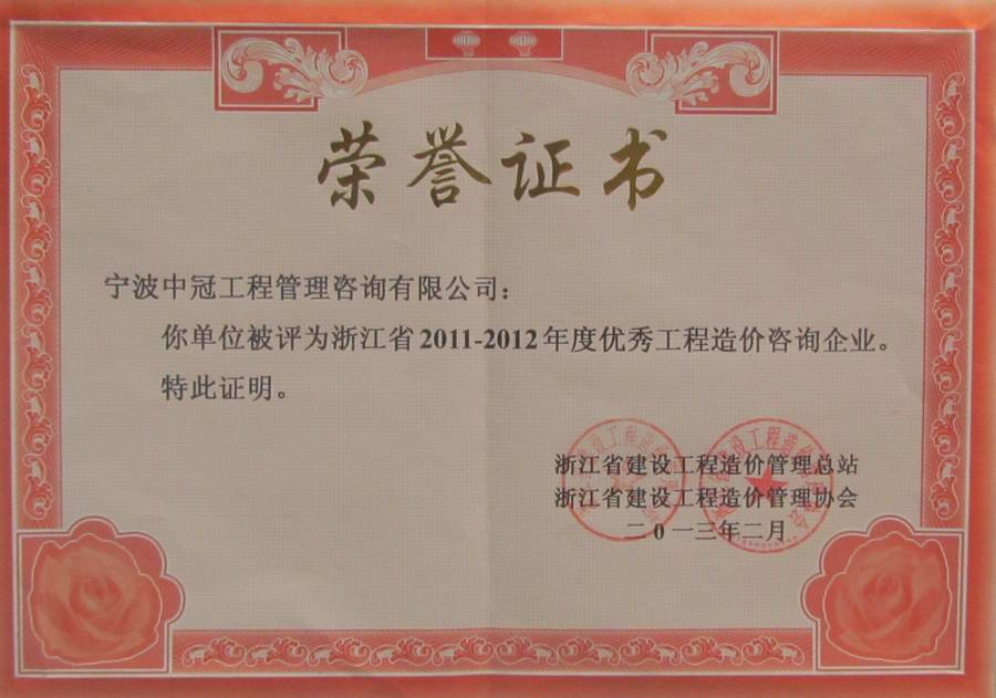 浙江省2011-2012年度優(yōu)秀工程造價咨詢企業(yè)-中冠榮譽(yù)-中冠咨詢-中冠工程管理咨詢有限公司