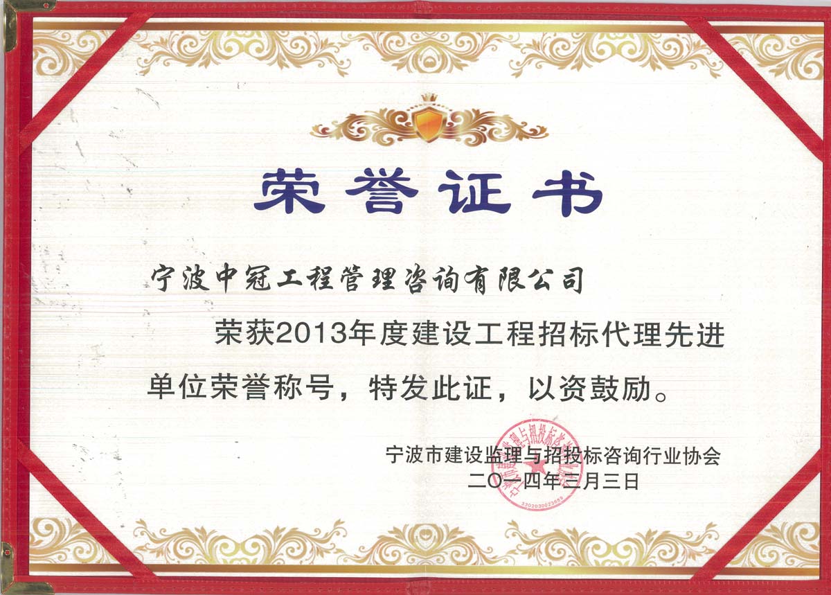 2013年度建設工程招標代理先進單位榮譽稱號-中冠榮譽-中冠咨詢-中冠工程管理咨詢有限公司
