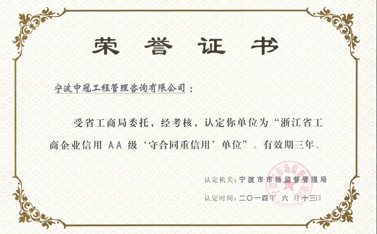 浙江省工商企業(yè)信用戶AA級‘守合同重信用’單位榮譽證書-中冠榮譽-中冠咨詢-中冠工程管理咨詢有限公司
