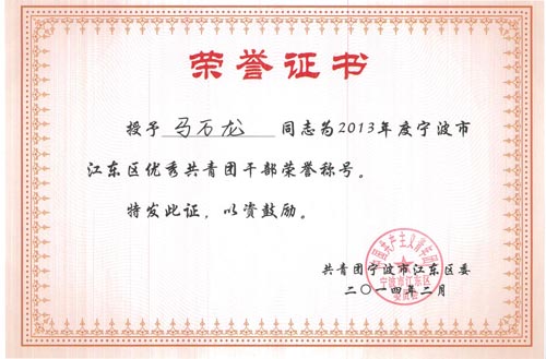 我公司馬萬龍同志于2014年2月,被共青團寧波市江東區(qū)委授予2013年度寧波市江東區(qū)優(yōu)秀共青團干部榮譽稱號。