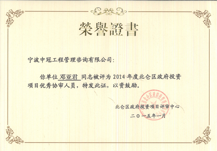 我司鄧亞君同志于2015年1月,被寧波市北侖區(qū)政府投資項目評審中心授予2014年度北侖區(qū)政府投資項目優(yōu)秀協(xié)審人員稱號。