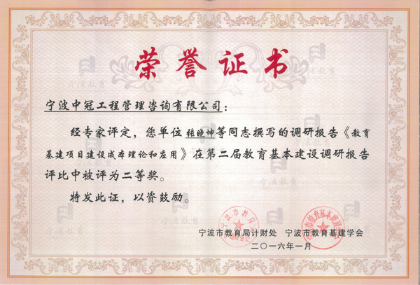 根據(jù)寧波市教育局計財處、寧波市教育基建學(xué)會,近期發(fā)布的《關(guān)于公布第二屆教育基本建設(shè)調(diào)研報告評比結(jié)果的通知》,我公司張曉坤撰寫的調(diào)研報告《教育基建項目建設(shè)成本理論和應(yīng)用》在第二屆教育基本建設(shè)調(diào)研報告評比中榮獲二等獎