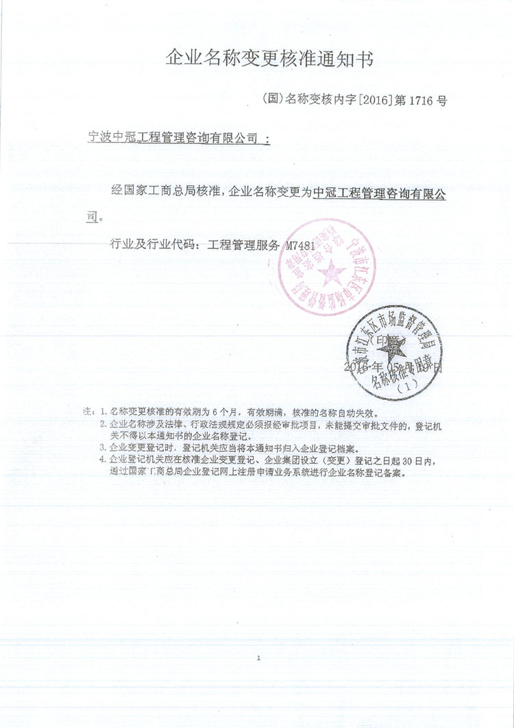 為配合公司中長期發(fā)展規(guī)劃,經(jīng)公司研究決定,現(xiàn)將公司名稱更名為“中冠工程管理咨詢有限公司”,注冊資金增資至5000萬;上述內(nèi)容已獲工商批準通過。 自2016年6月7日起,公司統(tǒng)一使用最新公司名稱。 (后附名稱變更核準通知書)