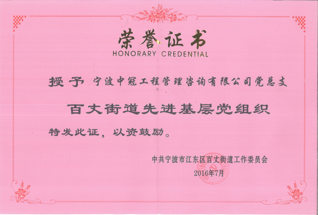 根據(jù)中共寧波市江東區(qū)百丈街道工作委員會近期發(fā)布的《中共寧波市江東區(qū)百丈街道黨工委關(guān)于表彰街道優(yōu)秀共產(chǎn)黨員、優(yōu)秀黨務(wù)工作者、先進(jìn)基層黨組織的決定》,我公司黨總支被授予“百丈街道先進(jìn)基層黨組織”榮譽(yù)稱號。