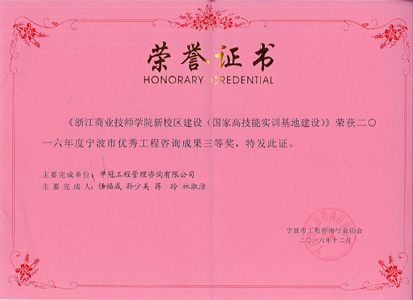 根據(jù)寧波市工程咨詢行業(yè)協(xié)會,近期發(fā)布的《關(guān)于公布2016年度寧波市優(yōu)秀工程咨詢成果獎獲獎項目名單的通知》(甬咨[2016]4號),經(jīng)評審由我公司任福成、孫少美、蔣玲、林淑潔等人員編制的《浙江商業(yè)技師學院新校區(qū)建設(shè)(國家高技能實訓(xùn)基地建設(shè))》項目可行性研究報告榮獲2016年度寧波市優(yōu)秀工程咨詢成果獎三等獎。 特此報喜