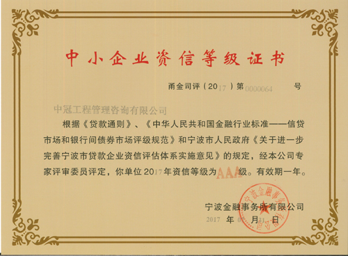 根據(jù)《貸款通則》、《中華人民共和國(guó)金融行業(yè)標(biāo)準(zhǔn)--信貸市場(chǎng)和銀行間債券市場(chǎng)評(píng)級(jí)規(guī)范》和寧波市人民政府《關(guān)于進(jìn)一步完善寧波市貸款企業(yè)資信評(píng)估體系實(shí)施意見》的規(guī)定,經(jīng)寧波金融事務(wù)所有限公司專家評(píng)審委員會(huì)評(píng)定,我公司被授予“2017年度中小企業(yè)資信等級(jí)AAA級(jí)”榮譽(yù)稱號(hào)。 辦公室