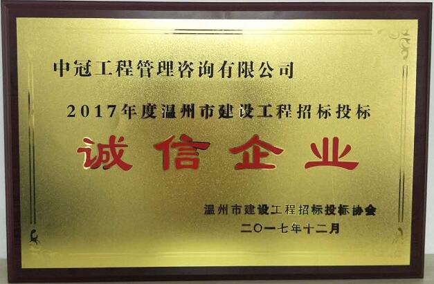 根據(jù)溫州市建設(shè)工程招標(biāo)投標(biāo)協(xié)會(huì)近期發(fā)布的《關(guān)于發(fā)布“2017年度溫州市建設(shè)工程招標(biāo)投標(biāo)優(yōu)秀誠信企業(yè)”名單的通知》,我公司被評(píng)選為“2017年度溫州市建設(shè)工程招標(biāo)投標(biāo)優(yōu)秀誠信企業(yè)”。