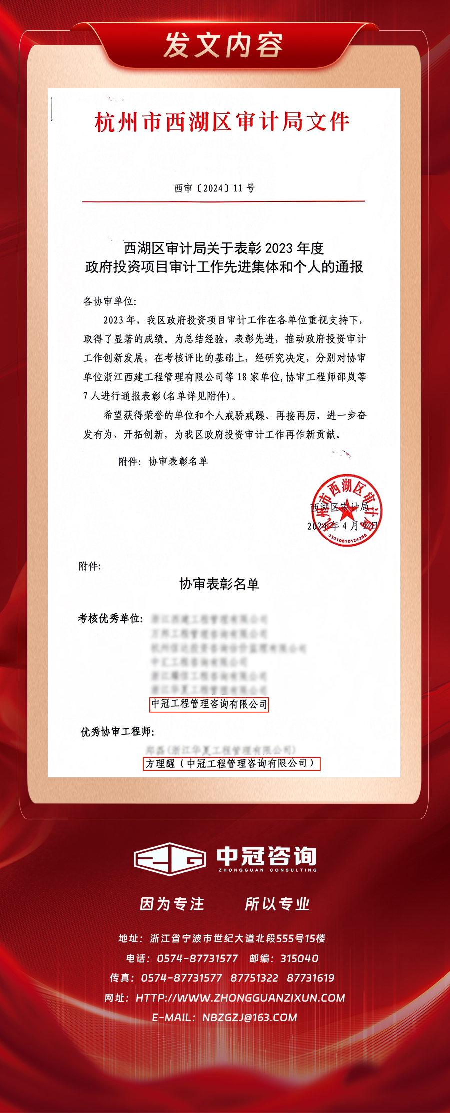 中冠喜報 | 我司榮獲杭州市西湖區(qū)審計局2023年度政府投資項目審計工作先進集體和個人表彰-中冠新聞-中冠咨詢-中冠工程管理咨詢有限公司